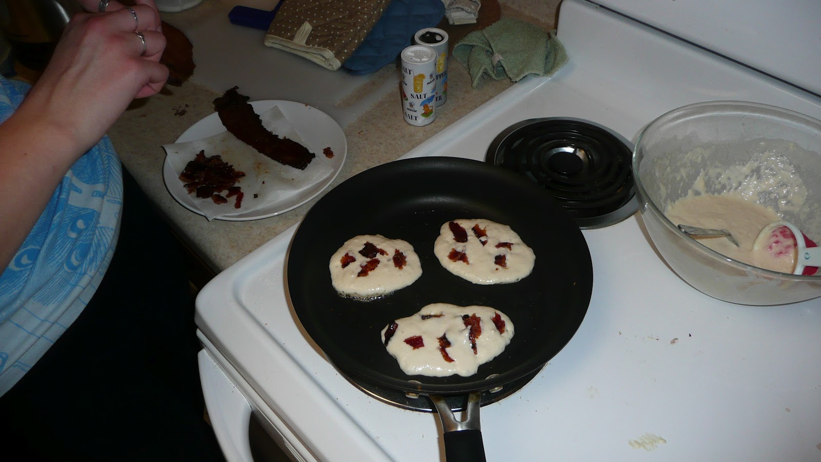 Now you can make your pancakes just like you would any other day. I used Bisquick because it's what we had. Once the bacon had cooled down a bit I tore it up into little pieces and mixed them into the pancake mix like you would blueberries or M&Ms. Cook and serve.